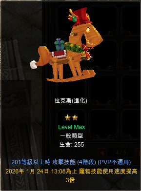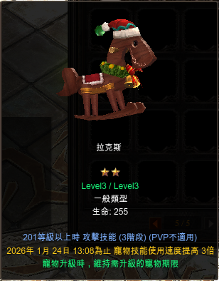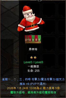 5.自2018年09月版本更新後,特殊寵物(保羅、喀戎)將不具有特效時間。